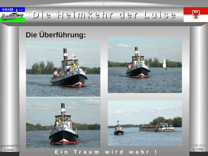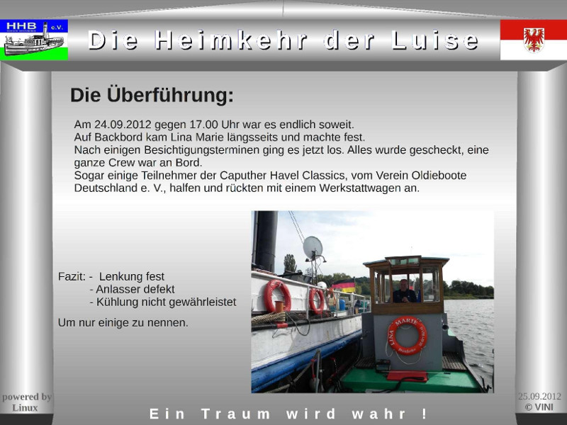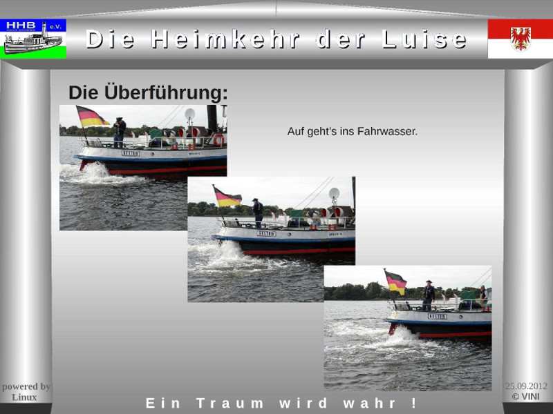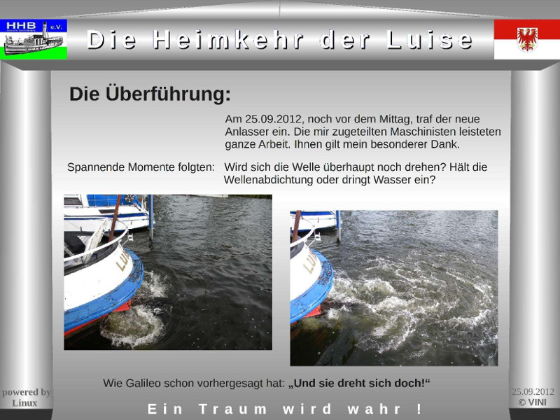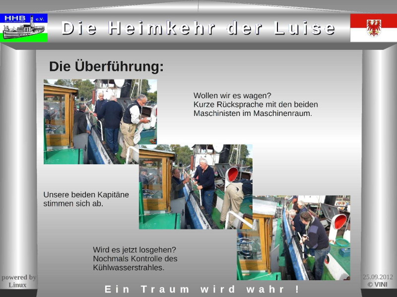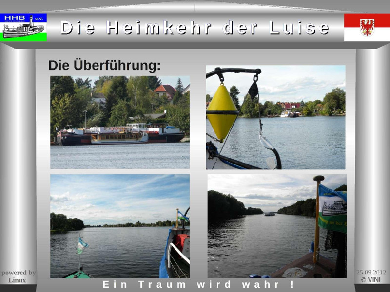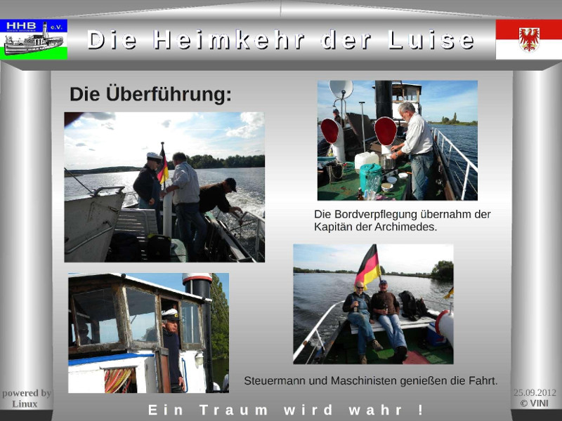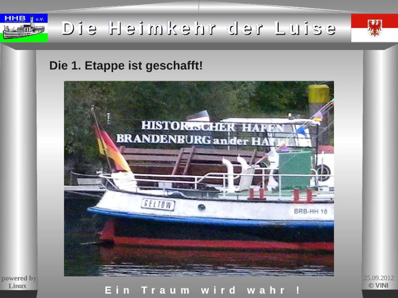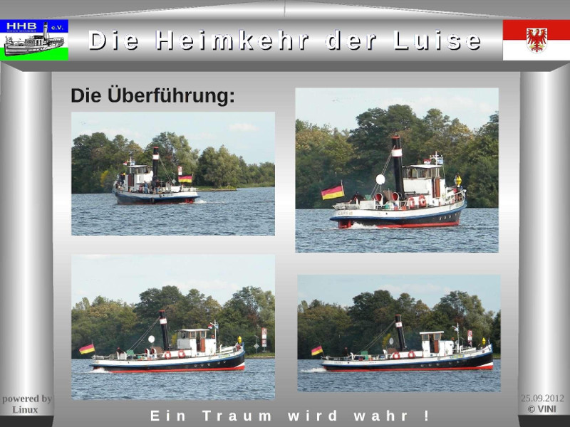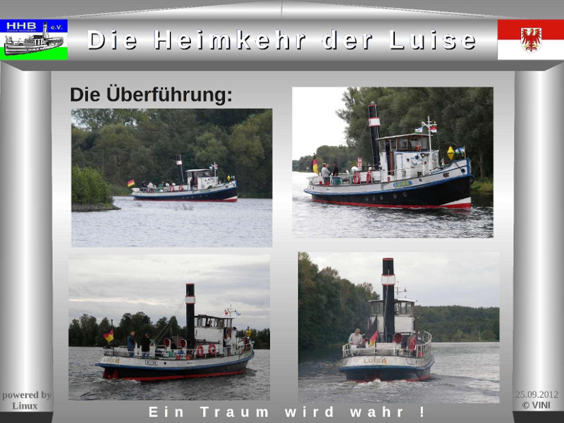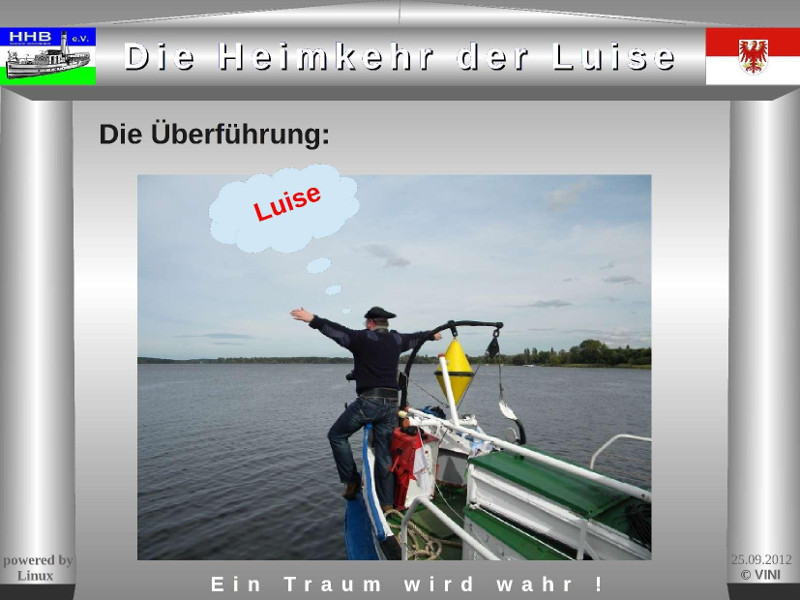 Nach einer Menge von Verhandlungen, der organisatorischen Vorbereitung und der finanziellen Absicherung war der SSD LUISE nun im Besitz des Vereins. Die Zulassung war während des Klarmachen des Schiffes in Geltow erteilt worden. Am 25.09.2012 war es dann soweit, der Tag der Überführung des SSD LUISE von Geltow nach Brandenburg an der Havel. Würde alles Glatt gehen? Ob nach 5 Jahren der Stillliegung des Schiffes, sie bei Fahrt Wasser aufnehmen oder im Rumpf trocken bleiben würde? Funktionieren noch alle Bauteile? Dieses Schiff ist immerhin schon eine betagte Dame von 102 Jahren (2012).