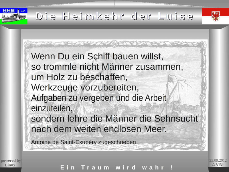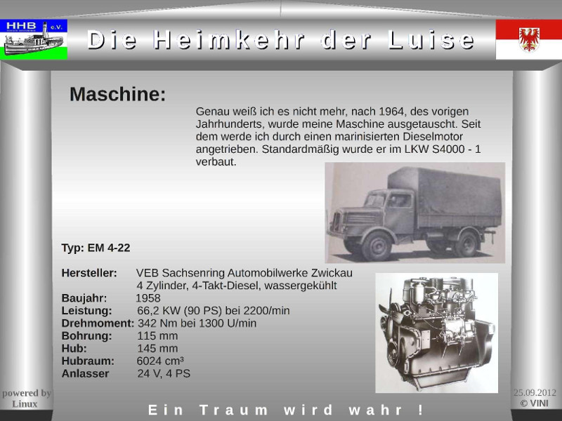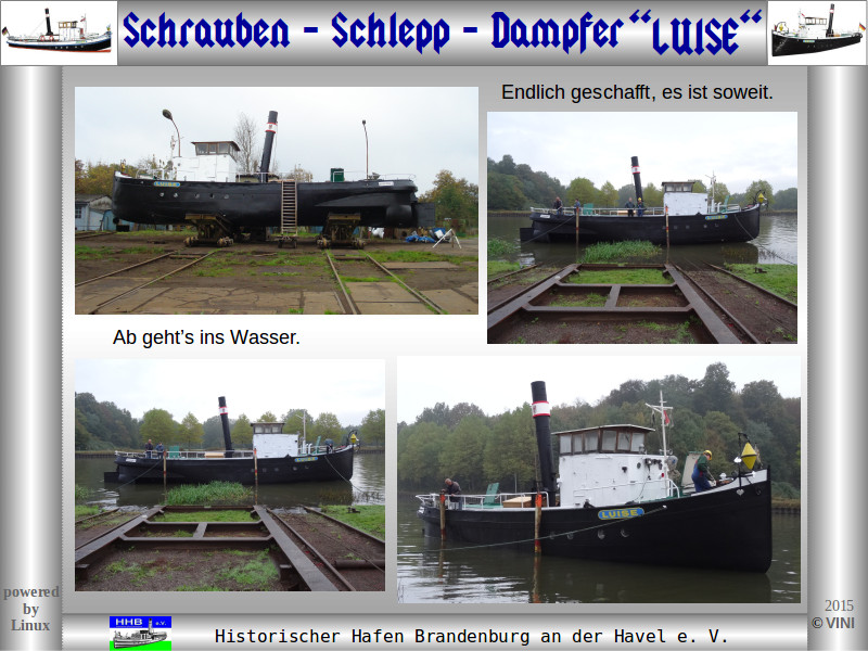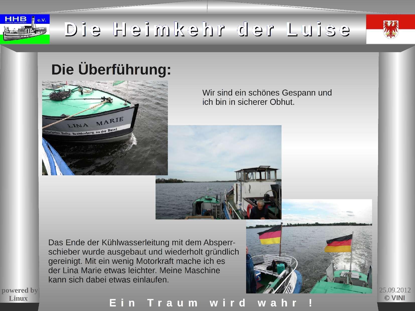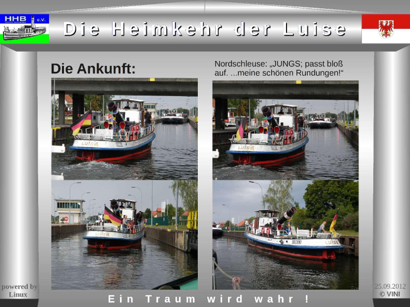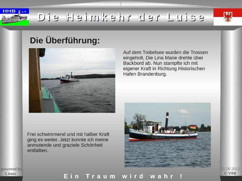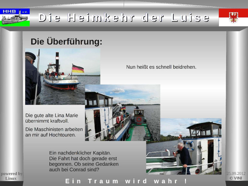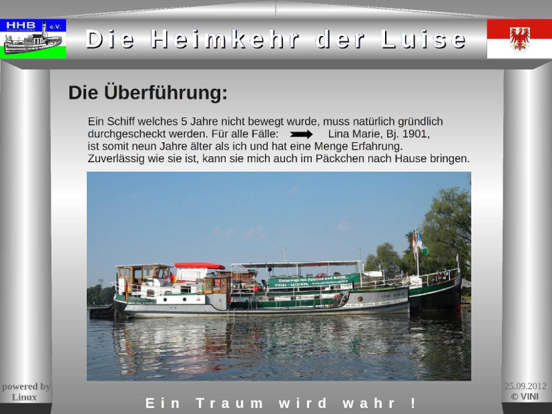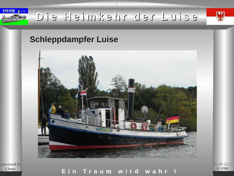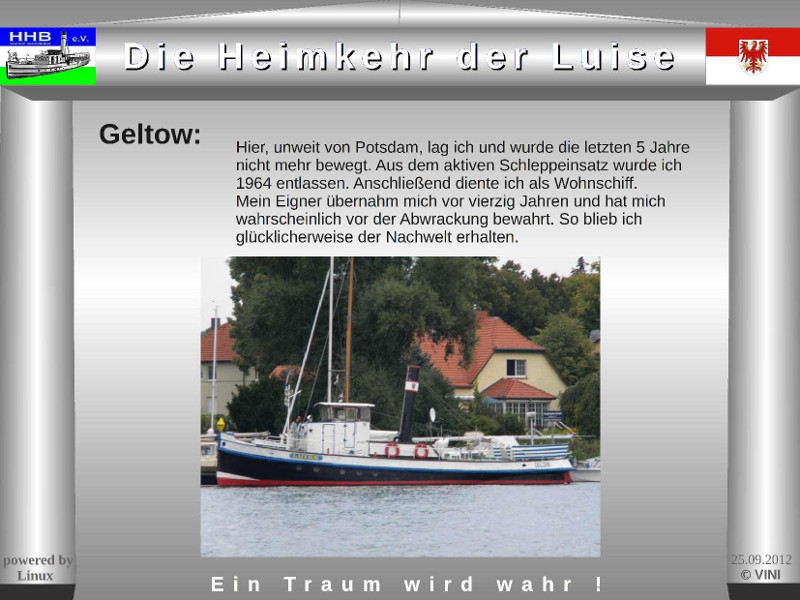 Nach einer Menge von Verhandlungen, der organisatorischen Vorbereitung und der finanziellen Absicherung war der SSD LUISE nun im Besitz des Vereins. Die Zulassung war während des Klarmachen des Schiffes in Geltow erteilt worden. Am 25.09.2012 war es dann soweit, der Tag der Überführung des SSD LUISE von Geltow nach Brandenburg an der Havel. Würde alles Glatt gehen? Ob nach 5 Jahren der Stillliegung des Schiffes, sie bei Fahrt Wasser aufnehmen oder im Rumpf trocken bleiben würde? Funktionieren noch alle Bauteile? Dieses Schiff ist immerhin schon eine betagte Dame von 102 Jahren (2012).