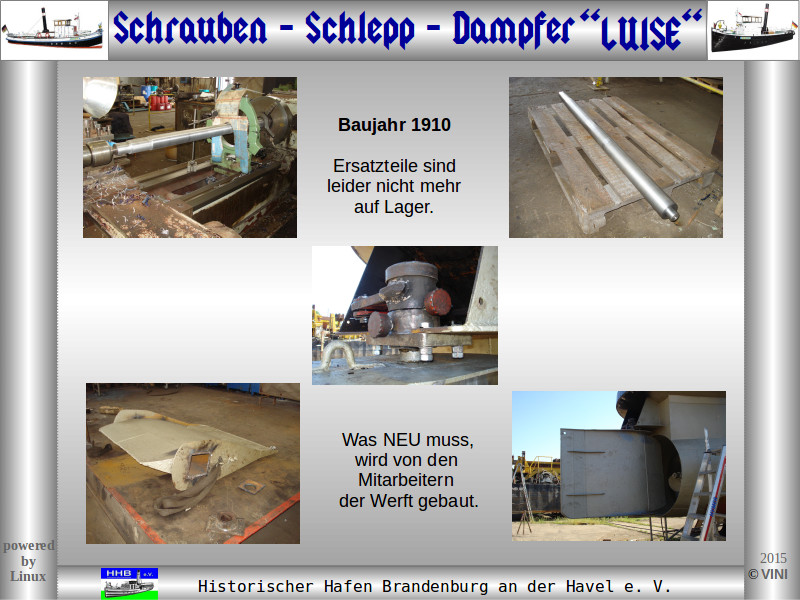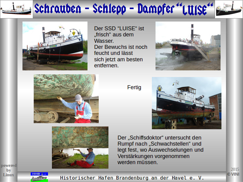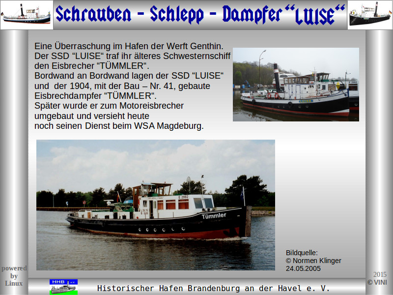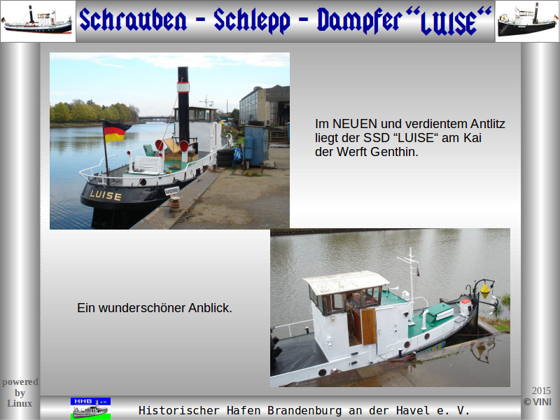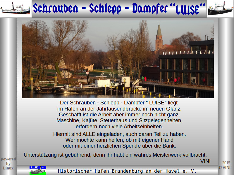 Als der Verein Historischer Hafen Brandenburg an der Havel e.V. erfuhr das der SSD LUISE, der seinen Heimathafen in Geltow (unweit von Potsdam) hatte verkauft werden soll, war die Aufregung groß. Die Gebrüder Wiemann Werft baute in der Mehrzahl Schlepper für die Binnenwasserstraßen und ihren Kanälen. Der Verein besitzt zwar eine absolute Rarität den Fischdampfer LINA MARIE, aber ein Vereinsschlepper, der auch noch auf der Werft gebaut wurde, fehlte noch.