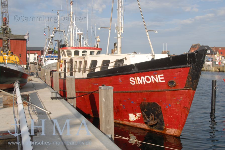 | Anmerkungen : | SIMONE war im August 2022 im Wiking-Hafen (Schleswig) gesunken, wurde gehoben 2023 an Lars Benn verkauft 12/2023 noch in Schleswig Für 2024 geplantes Verlegen wegen Krankheit des Eigentümers nicht realisiert Schiff liegt weiterhin (heruntergekommen) am Liegeplatz (7/2025), Eigentümer soll der Stadt ein Angebot betr. Abschleppen gemacht haben |