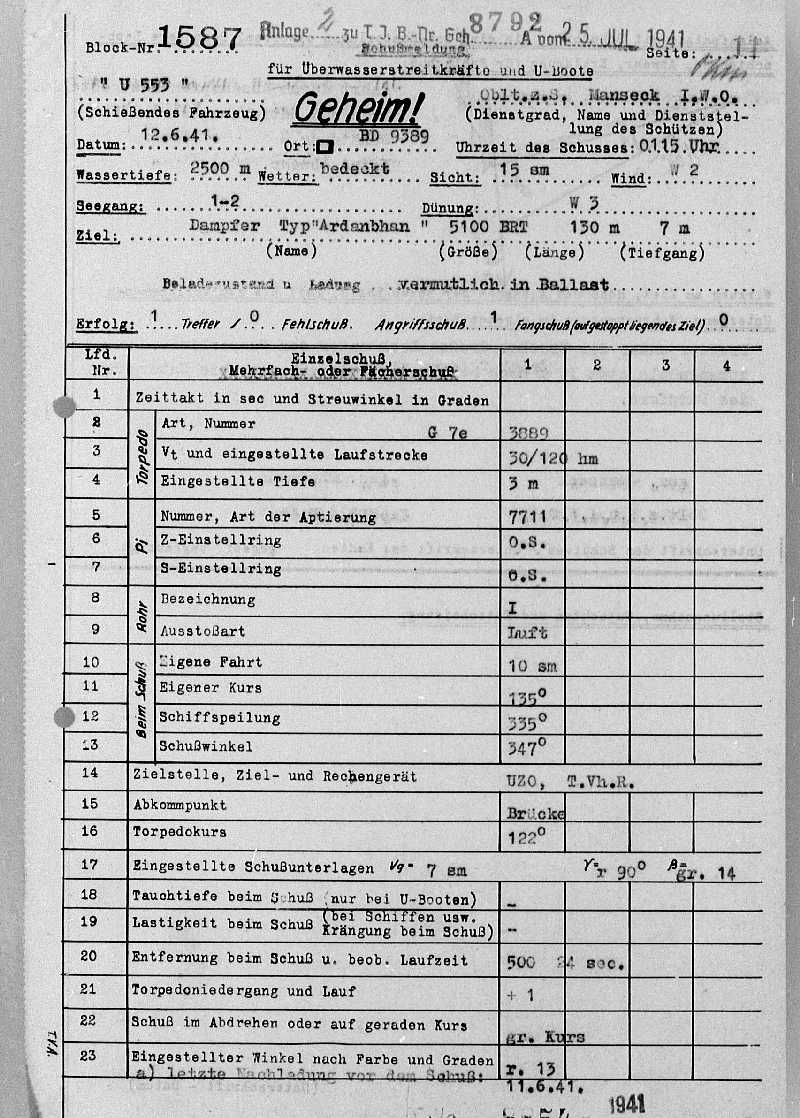 | Fussnote : | Nach einem Fehlschuss um 01.05 Uhr erfolgte ein Volltreffer um 01.22 Uhr. Das Schiff, das von U-553 getroffen wurde, sank in 90 Sek; es muss die "Susan Maersk" gewesen sein, die seit dem 13.6. vermisst wurde. |