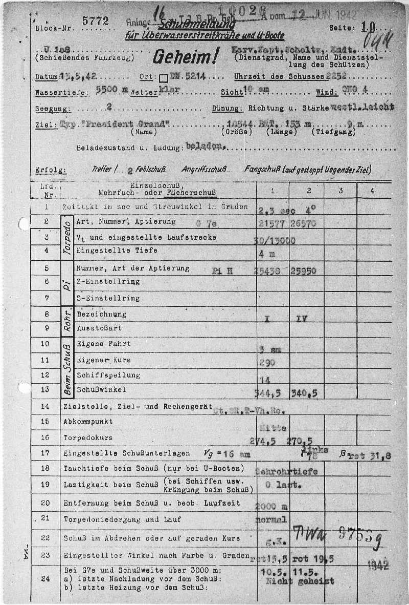 | Fussnote : | U-108 horchte 1 Detonation nach 3:00 Min auf einem Passagier-Frachter der "President Grant"-Klasse. |