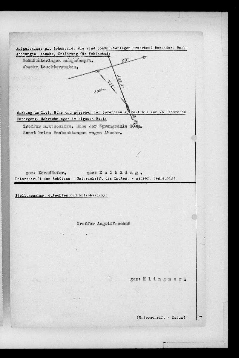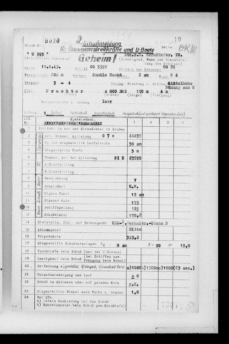 U-593 schoß auf einen kleinen Konvoi von 4 Frachtern und 3 Geleitschiffen und beobachtete nach 1:05 Min einen Treffer und das Auseinanderbrechen des Schiffes, und 1:03 Min später einen weiteren Treffer.
