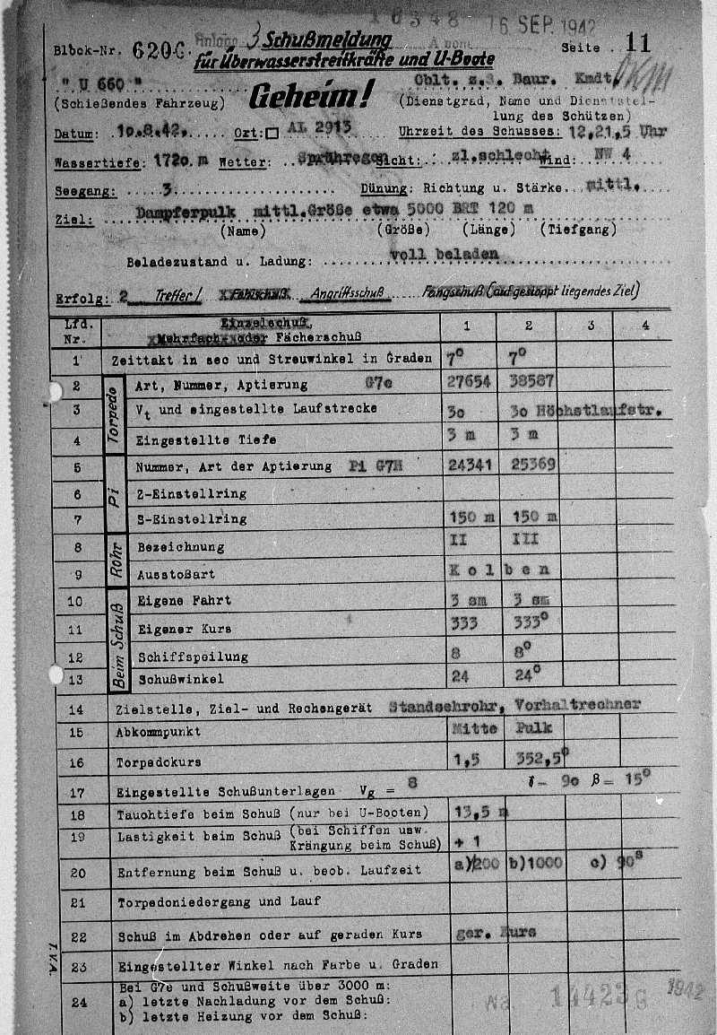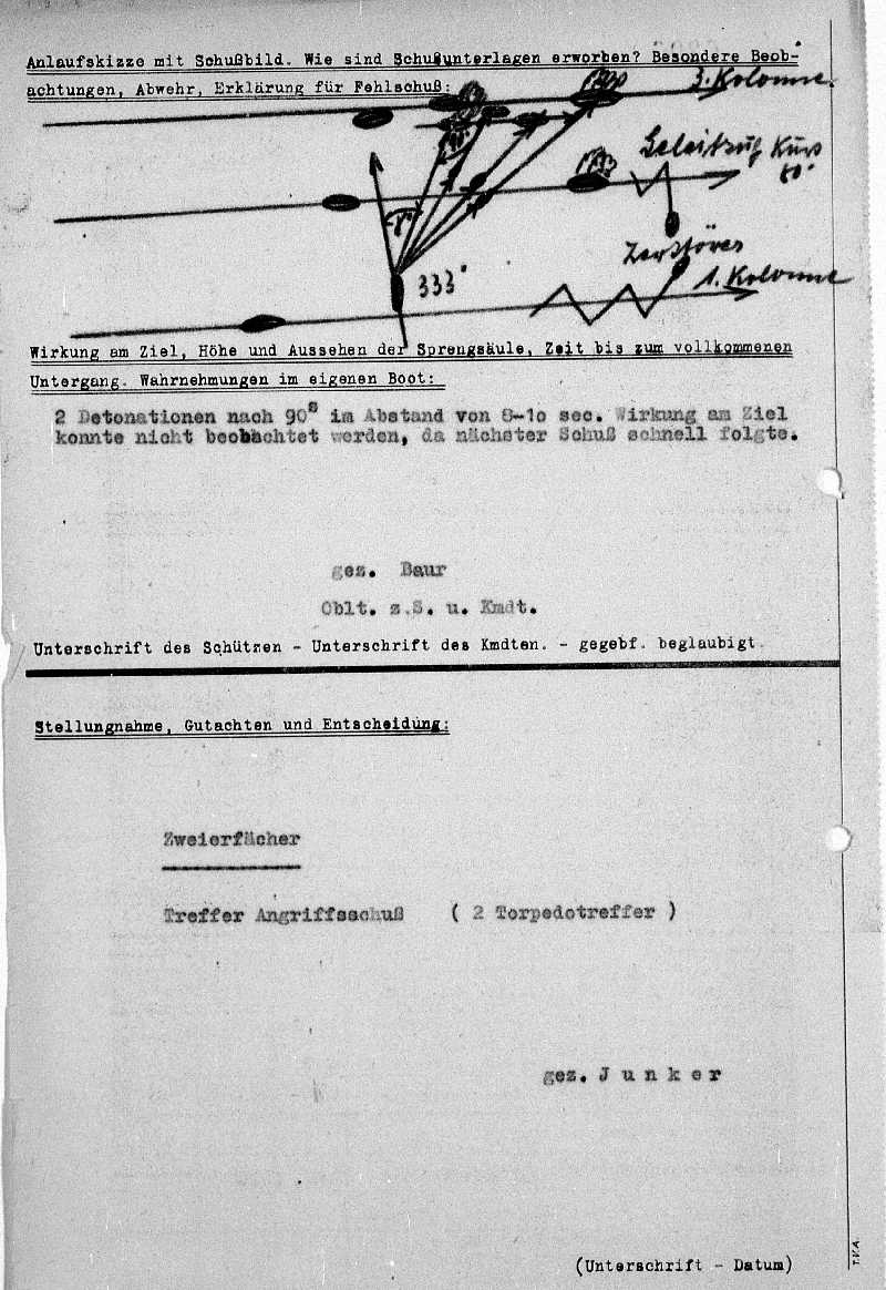 Fussnote : U-660 feuerte einen Einzelschuß, einen 2er-Fächer und einen weiteren Einzelschuß. Es gab eine Detonation nach 47 Sek, zwei nach 1:30 Min, und wiederum eine Detonation nach 50 Sek. U-438 beobachtete eine Detonation nach 2:30 Min. – "Condylis" wurde von je einem Torpedo an Steuerbord- und Backbordseite getroffen, also allem Anschein nach von zwei U-Booten. Die anderen Schiffe wurden lediglich an Steuerbord getroffen, also wohl von U-660. Der von U-438 später versenkte Havarist dürfte die "Oregon" gewesen sein.