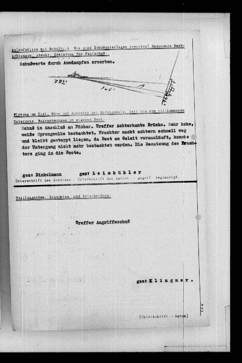Op.- : Westraum Seegebiet : Nordatlantik Angriffs-Datum : 28.12.1942 Angriffs-Zeit : 22:02 Nation d. U-Bootes : deutsch Name des U-Bootes : U 225 Kommandant : Leimkühler Quadrat : BD 9869 angenommener Ziel-Typ : Dampfer, Frachter angenommene Tonnage : 5000 BRT angenommenes Ergebnis : versenkt Eingesetzte Waffe(n) : Torpedo(s) Konvoi : ON.154 Beobachtungs-Datum : 28.12.1942 Beobachtungs-Zeit : 21:20 Nation des Ziels : britisch tatsächlicher Ziel-Typ : Dampfer, Frachter Name des Ziels : Ville de Rouen Stapellauf : 1919 tatsächliche Tonnage : 5083 BRT tatsächliches Ergebnis : beschädigt Position des Ziels : 43.25n 27.15w Fussnote : "Ville de Rouen" wurde durch Hecktorpedo getroffen und beschädigt. Am 29.12. wurde sie um 1:30 Uhr von U-662 / Hermann versenkt (siehe Angriff 2). Zugehörige Angriffe :