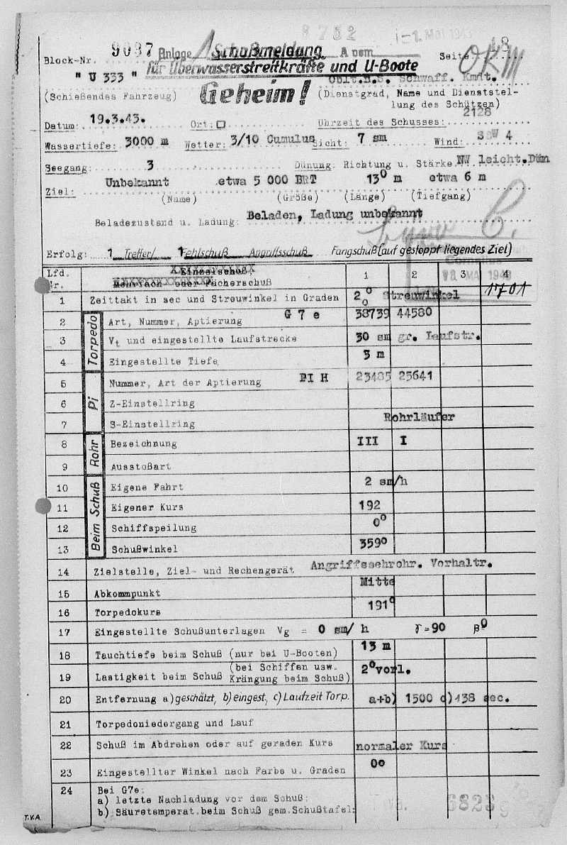 | Fussnote : | "Carras" wurde am Morgen des 19.März von U-666/Engel getroffen (siehe FN.3244). Sie blieb schwimmfähig, und wurde von U-333 mit Fangschuß versenkt. |