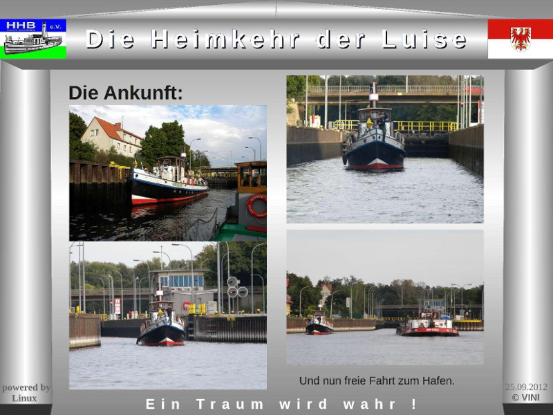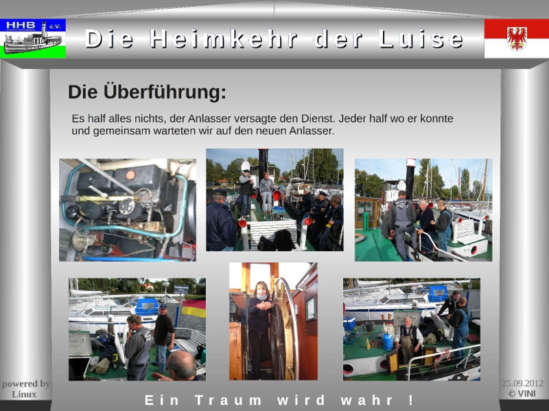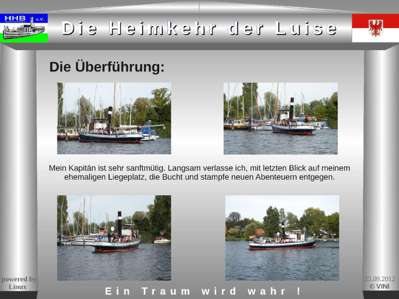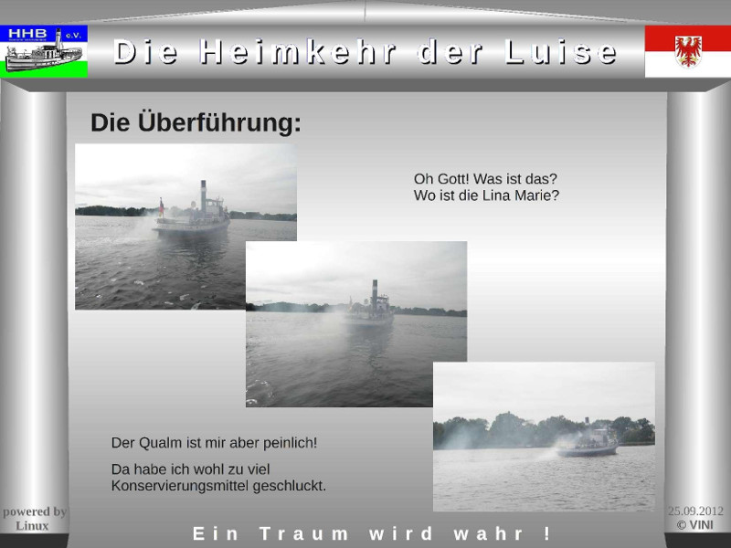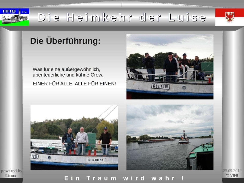 Nach einer Menge von Verhandlungen, der organisatorischen Vorbereitung und der finanziellen Absicherung war der SSD LUISE nun im Besitz des Vereins. Die Zulassung war während des Klarmachen des Schiffes in Geltow erteilt worden. Am 25.09.2012 war es dann soweit, der Tag der Überführung des SSD LUISE von Geltow nach Brandenburg an der Havel. Würde alles Glatt gehen? Ob nach 5 Jahren der Stillliegung des Schiffes, sie bei Fahrt Wasser aufnehmen oder im Rumpf trocken bleiben würde? Funktionieren noch alle Bauteile? Dieses Schiff ist immerhin schon eine betagte Dame von 102 Jahren (2012).