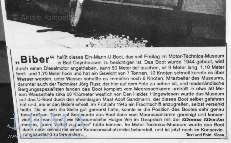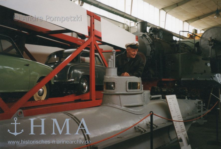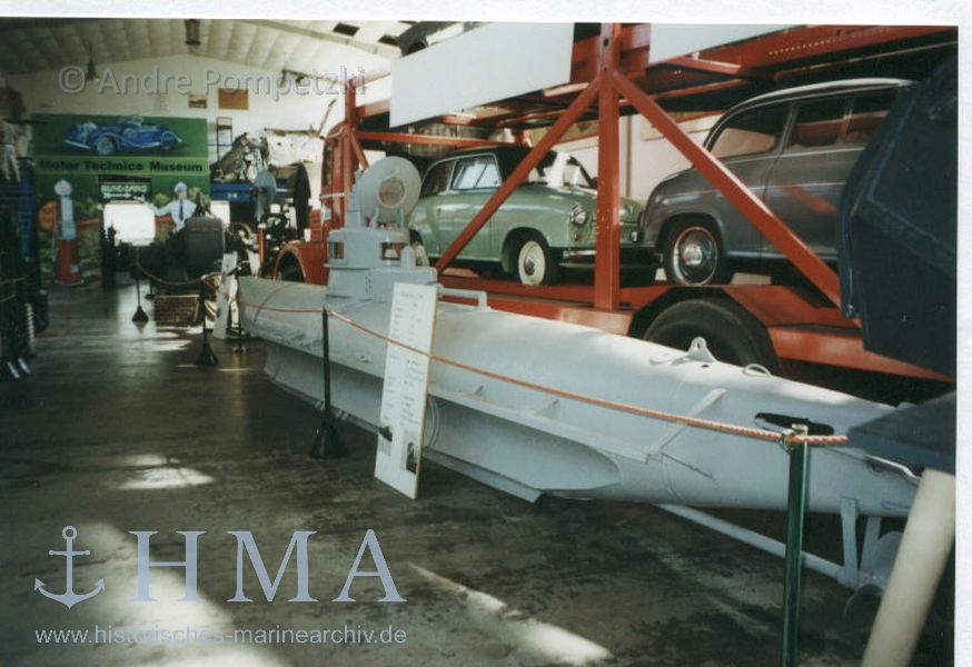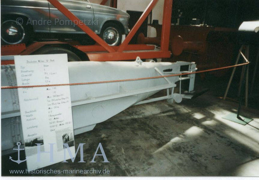 | Anmerkungen : | Frühjahr 1945 vom Maat Adolf Sandmann 50 km westlich Den Helder vor einem Einsatz selbst versenkt. Nach Hinweisen von Sandmann durch ein niederländisches Bergungsunternehmen und Mitarbeitern des Museum aus 50 m Wassertiefe geborgen.