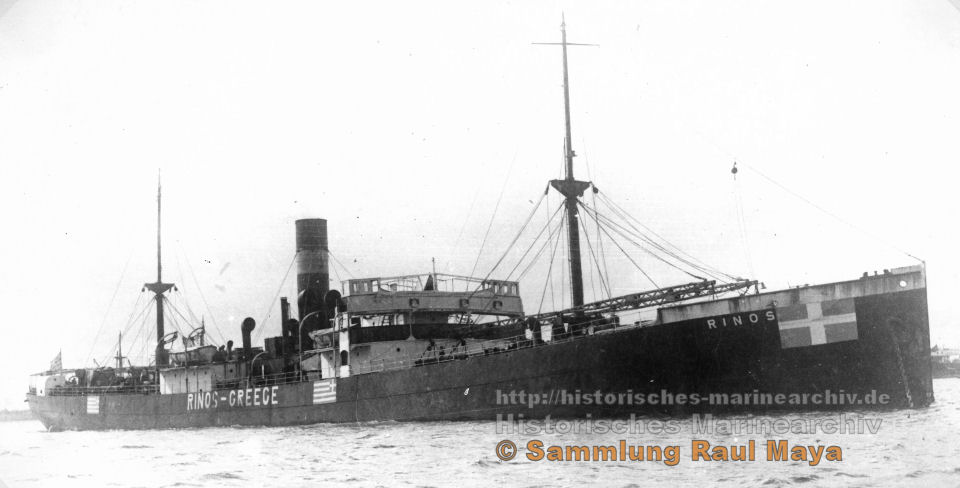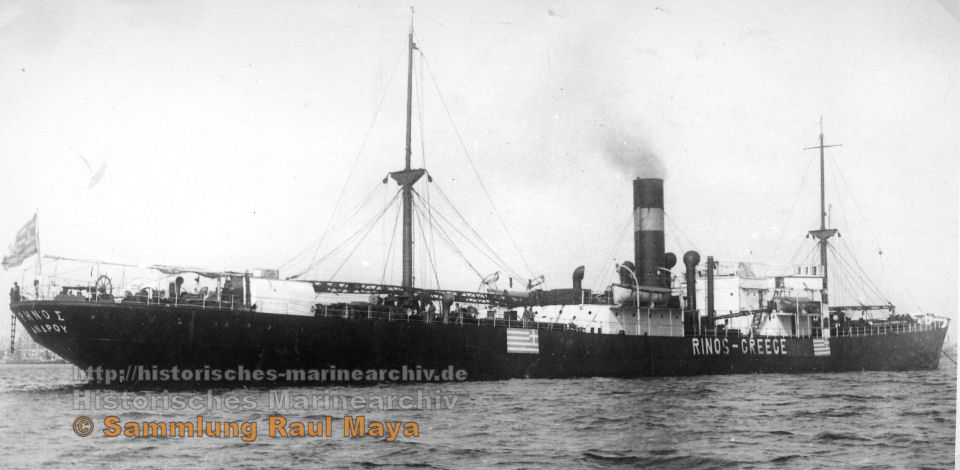 | Mannschafts-Schicksal : | 5 Verluste, 26 gerettet [B] / 8 Verluste, 23 gerettet [C] Verlustliste: Georgios Giovasis (dritter Maschinist), Ioannis Archontopoulos (Öler), Konstantinos N. Voulgaris (Maat, alle Griechen), Jacob Brown (Heizer, Brite), Kapel Wens (Heizer, Belgier). |