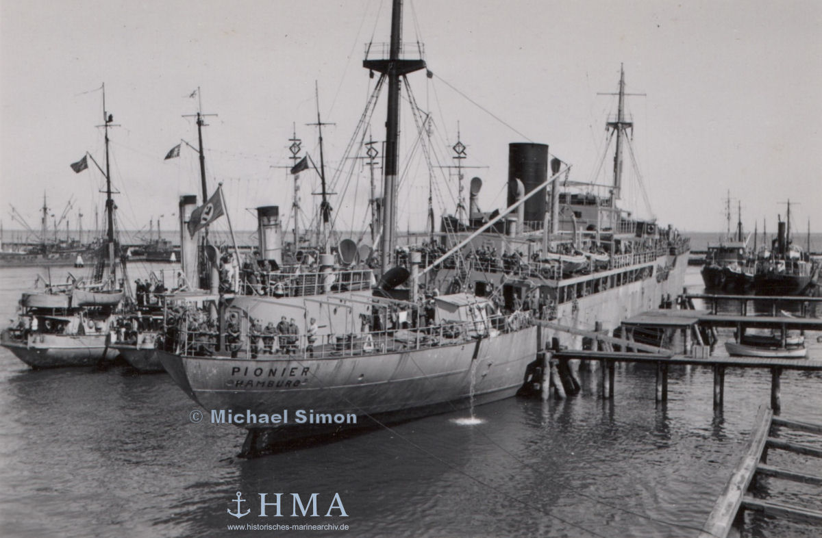 1930 Dez. 30.: An die Reederei als Kühlschiff PIONIER (DJML) abgeliefert. Vermeßen mit: 2863 BRT / 1935 NRT / 2739 tdw. Antrieb: ein 6-zyl. 2-takt - MAN, Augsburg (3600 PS) Dieselmotor. Heimathafen Hamburg. In Fruchtfahrt zw. Hamburg-Westafrika eingesetzt.